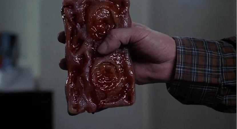 这部电影带领我们进入的正是电视观众坐在影像方盒前的日常状态。这个身体在成为自身影像的冒险过程中,甚至需要舍弃皮肤(更确切说,是舍弃肉体),但并非采用奇幻的方式来拍摄。超越镜面(电视屏幕)并非源自卡罗尔式的魔法作用——《录影带谋杀案》并非“爱丽丝恐怖奇遇记”的新版本。如果说整个机制的最初动力源于感知和幻觉,那么柯南伯格赋予它一种独特的转向(幻觉变成一种局部化的现象,一个脑部肿瘤、一只“第三眼”——让人联想到《夺命凶灵》中的“松果体眼”),直至彻底颠覆原本的设定。警示不再是“请勿将欲望当成现实”,而恰恰相反:请勿将现实当成幻觉。麦克斯·雷恩最终消融在自己的录像影像中,而柯南伯格拍下了这个过程的前兆:电视观众身体上可见的变形。